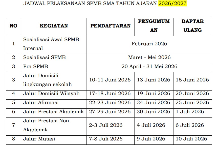 Penerimaan murid baru merupakan rangkaian proses bagi masyarakat usia sekolah dalam proses pendidikan di suatu jenjang pendidikan, seperti halnya penerimaan murid baru dari lulusan jenjang pendidikan dasar Sekolah Menengah Pertama/Madrasah Tsanawiyah (SMP/MTs) ke jenjang pendidikan menengah Sekolah Menengah Atas/Sekolah Menengah Kejuruan (SMA/SMК). Terdiri dari Jalur Domisili 30%, Jalur Afirmasi 30%, Jalur Mutasi 5%, Jalur Prestasi 30% (Akademik 25% dan Non Akademik 5%).
