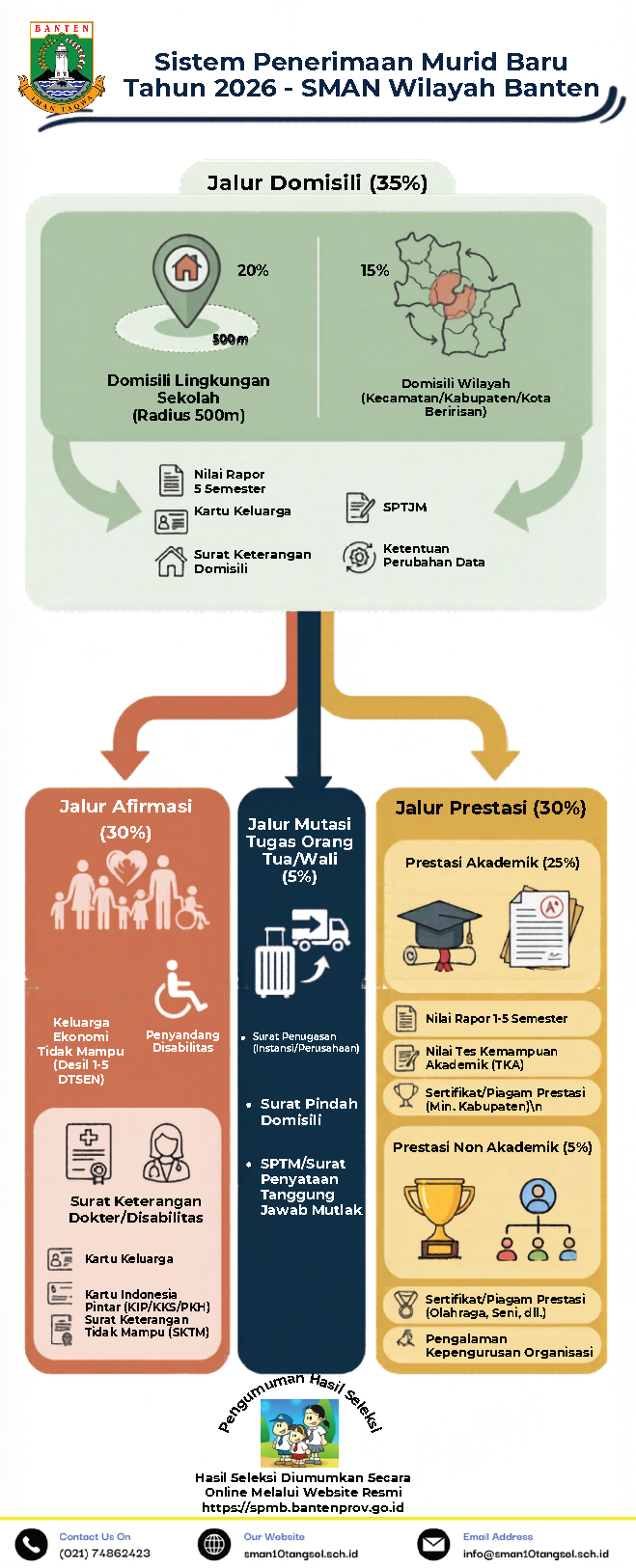 Jalur Domisili : Jalur Domisili Lingkungan Sekolah dengan jarak radius 500 meter [20%] dan jarak domisili wilayah dengan wilayah kecamatan yang beririsan maupun kabupaten kota yang berdekatan di wilayah banten [15%]